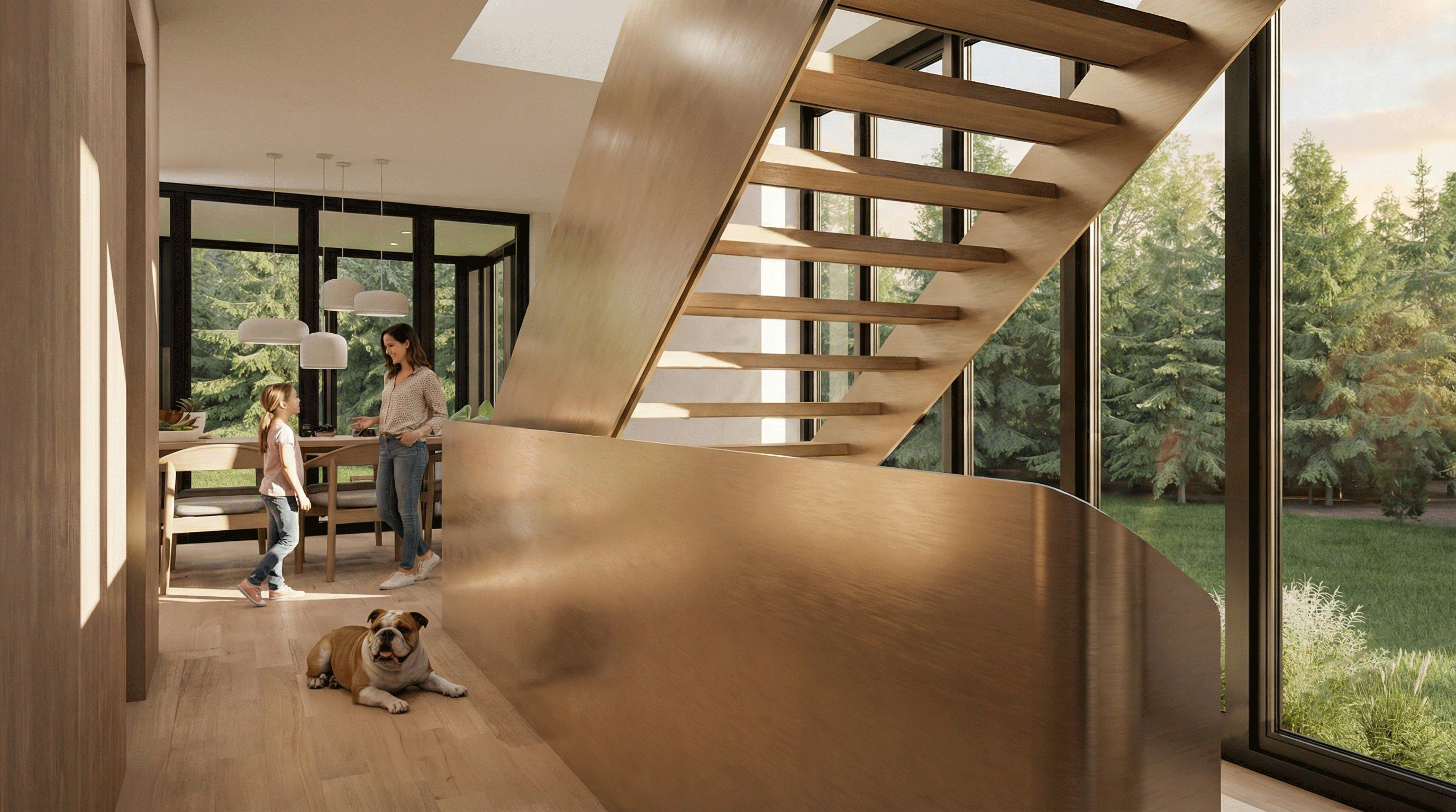 Cet interstice capte la lumière naturelle, relie les niveaux et met en scène le passage : un seuil habité où l’on quitte la matière du monde extérieur pour entrer dans un espace de calme et de clarté.