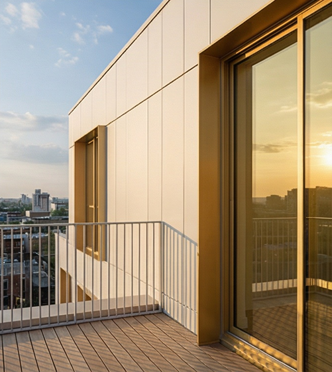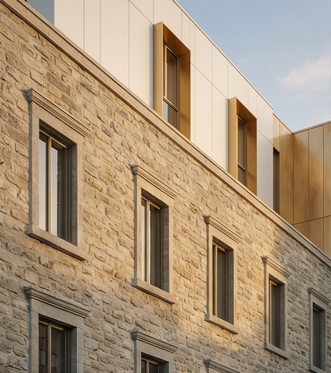 Une première strate en pierre, rythmée par des modénatures classiques, recomposeune continuité patrimoniale et accueille des espaces commerciaux dynamiques pour Metah Nomis, tandis que les volumes résidentiels, plus contemporains,déploient une écriture en métal blond et blanc, jouant sur une trame subtileentre héritage interprété et modernité assumée.