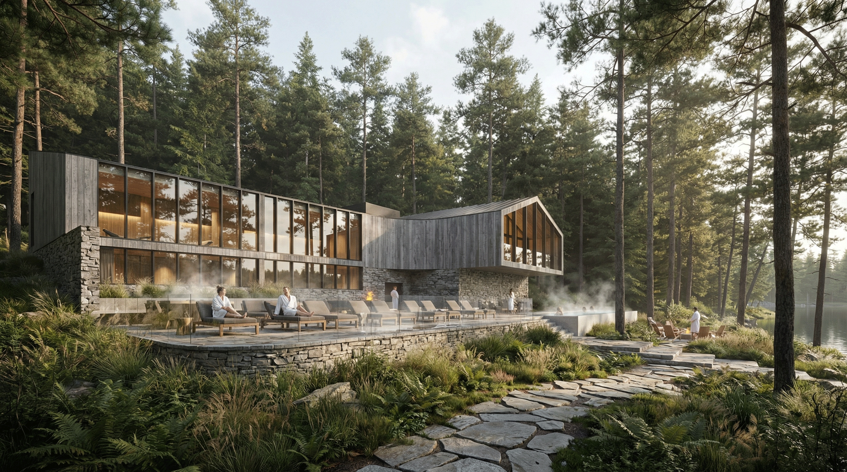 Les pavillons extérieurs, disséminés à travers le domaine, prolongent l’expérience. On y marche lentement, entre le vent, la vapeur et le feu. Des terrasses s’ouvrent sur la forêt ; des foyers de pierre rassemblent les visiteurs ; le soir, les flammes répondent à la lueur du lac, et le spa devient paysage. L’architecture s’exprime dans la matière avant tout.
